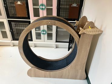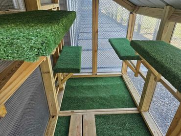 We have a special room just for your cats. We provide solid floor condos with beds, hammocks, individual litter boxes, beds, and more. Plus there is an added fee option for free room time, where they can climb on our carpeted cat shelves, cat trees, large cat wheel, toy time, and warm laps. We have a fully secure catio access as well.
